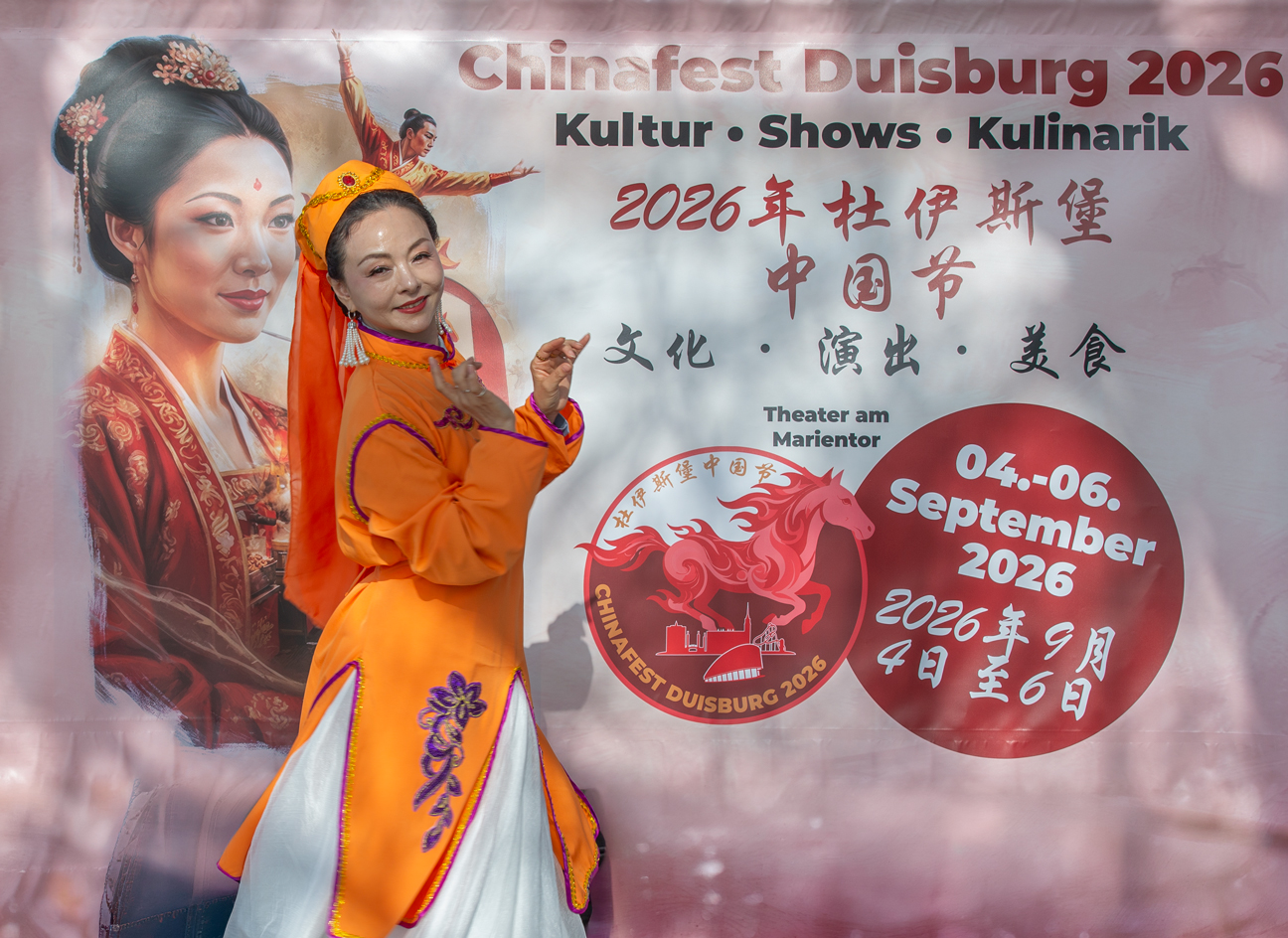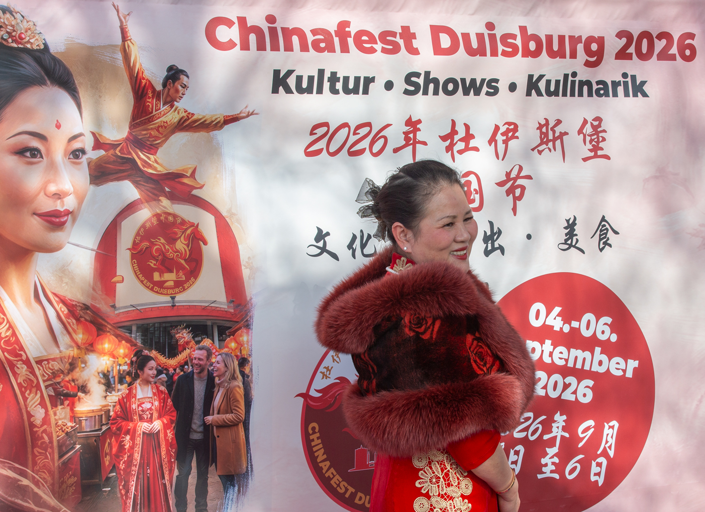 Kultureller Brückenschlag am Rheinufer: Huiying Tang, Vorsitzende des Vereins Chinesischer Frauen in Deutschland (VcfG), begrüßt den Düsseldorfer Generalkonsul Yu Yong vor dem offiziellen Banner des Chinafests Duisburg 2026. Der Austausch unterstrich die wachsende Vorfreude auf das kommende Großevent und die Bedeutung des kulturellen Dialogs.