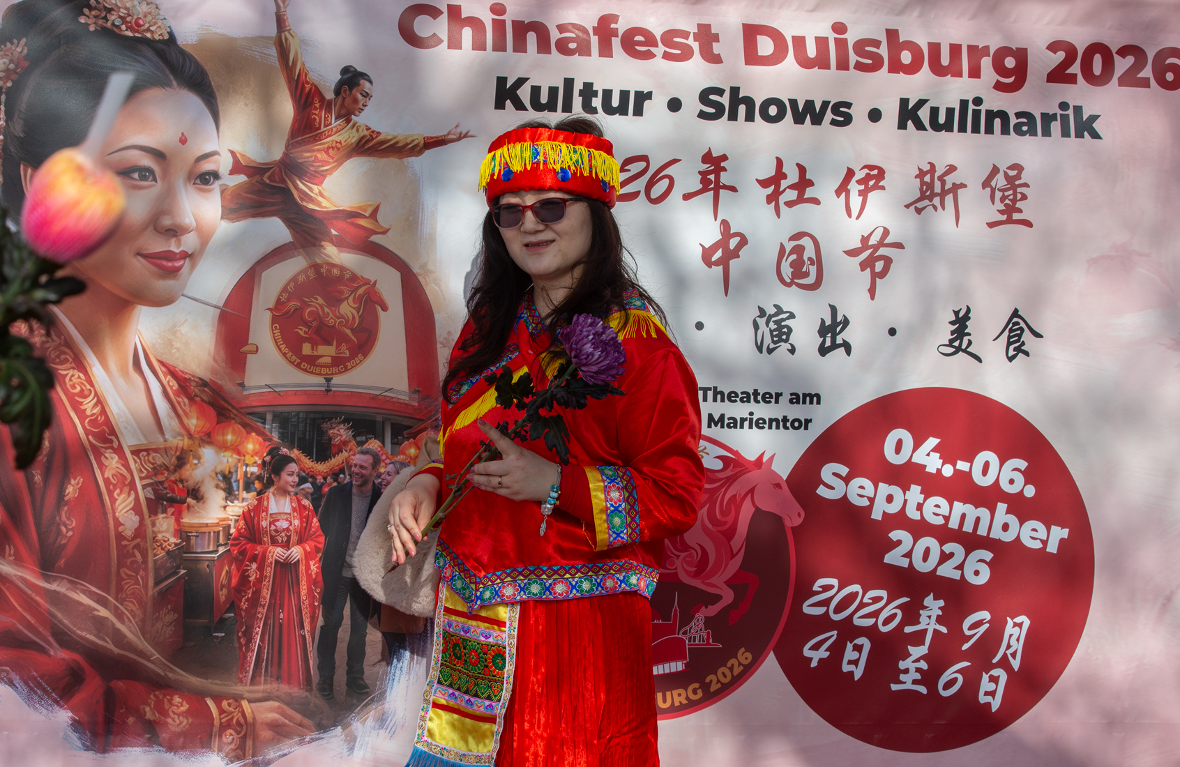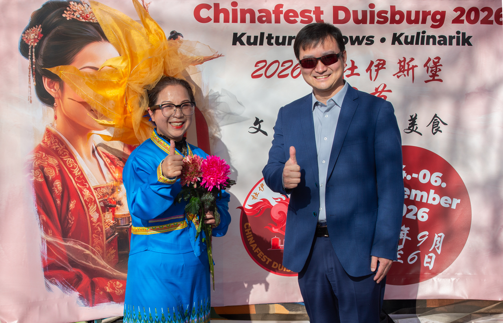 Kultureller Brückenschlag am Rheinufer: Huiying Tang, Vorsitzende des Vereins Chinesischer Frauen in Deutschland (VcfG), begrüßt den Düsseldorfer Generalkonsul Yu Yong vor dem offiziellen Banner des Chinafests Duisburg 2026. Der Austausch unterstrich die wachsende Vorfreude auf das kommende Großevent und die Bedeutung des kulturellen Dialogs.